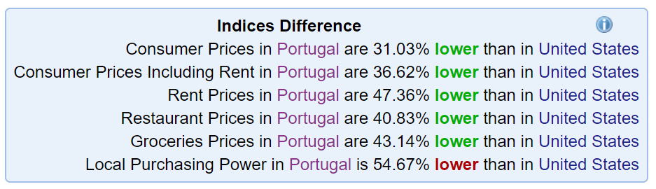 When looking at statistics the cost of living in Portugal are considerably lower then typical Western Countries. Take my own country (Belgium) for example: