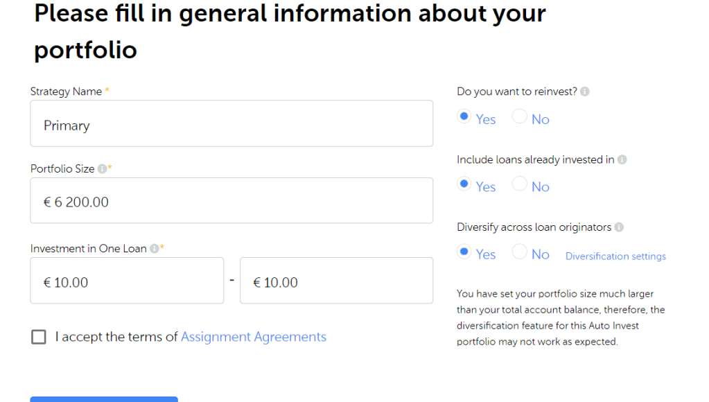 Other important settings are portfolio size (set this a little higher then the amount you will invest), and minimum/maxumum in one loan. I set my maximum at 10 EUR to get as much loans as possible.