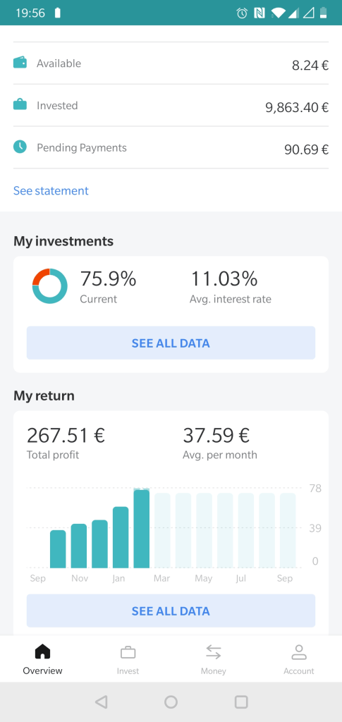Mintos has an APP now in the store you can download. I still need to use the Website for a lot of things, but one thing I like in particular is the graph that shows you the monthly profit. An easy and quick way to see at the end of the month how well your loans are performing.