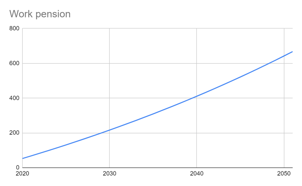 My previous job invested about 1% in a work pension, my current job even invests 6% of my yearly wage into a work pension. That’s quite interesting, because as it turns out it can grow to quite high by the time you are 67. The downside here is that the growth is limited by the minimum growth the government says the fund should have, which is pretty much the inflation. Still its a very nice boost you would get at 67. Using the 3% rule it would give me an additional 637 EUR at 67 if I kept working until then.