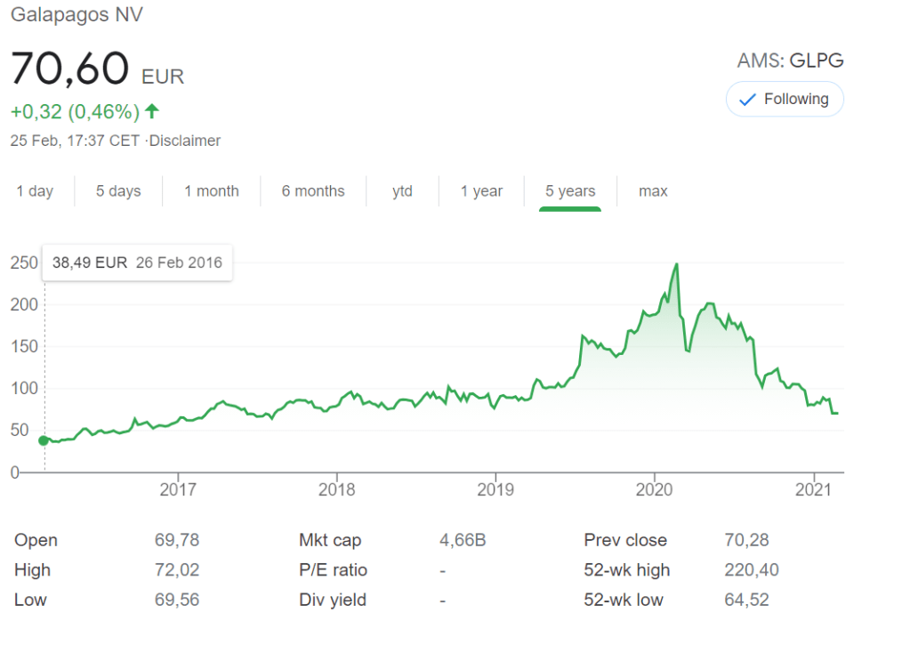 After the stock dropped from 250 EUR to 70 EUR, knowing that their cash position is huge, it is difficult not see potential in this stock. I really believe the stock is cheap right now and has a huge potential. The main reason why its trading so low is because Galapagos had a streak of bad news in 2021.