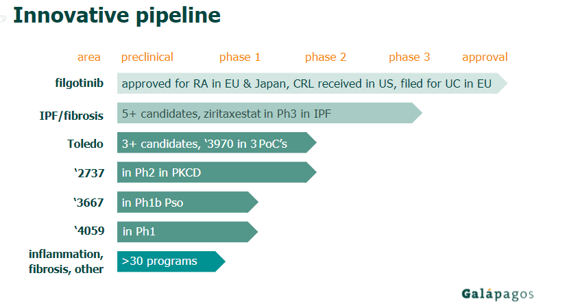 Galapagos still has a very big pipeline. Of course their medicines Filgotinib and Fibrosis failed unfortunately to get great results. BUT they still have 30+ programs in their pipeline, the most advanced being Toledo currently.