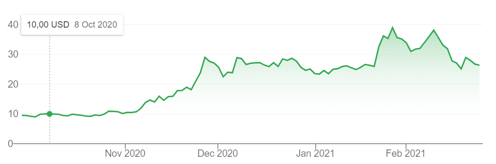 Palantir has been highly hyped. It only made its IPO near the end of 2020 and was valued first at $9.5 / stock. This year the stock reached peaks up to $45! The stock has been extremely bullish and somewhat volatile while its trying to search its price range.