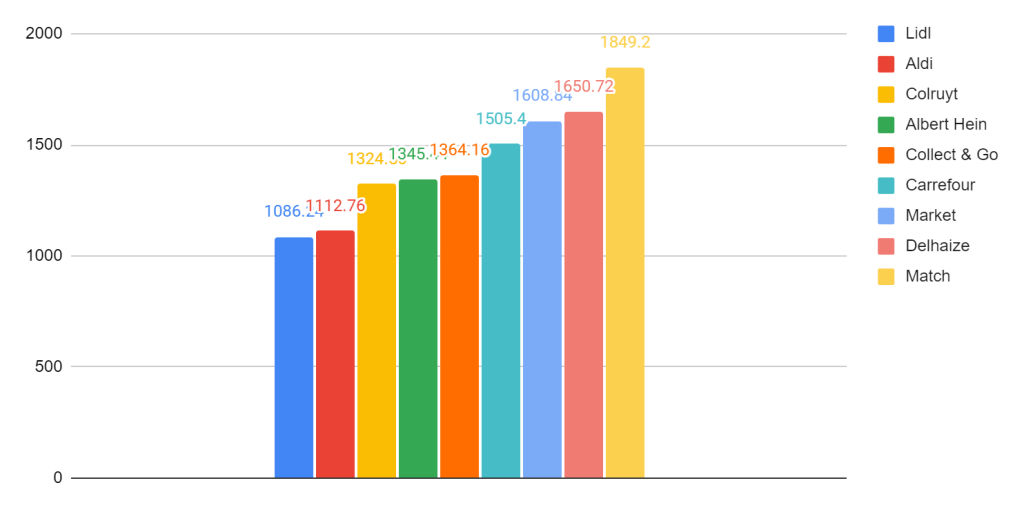 There is a difference of 762 EUR for just the basic food between the highest and lowest! If you would include other items like snacks and drinks it would probably go up even more. So it absolutely makes sense to focus more on the lower ends of the supermarkets. In my case I mainly go to the Aldi and Albert Hein.
