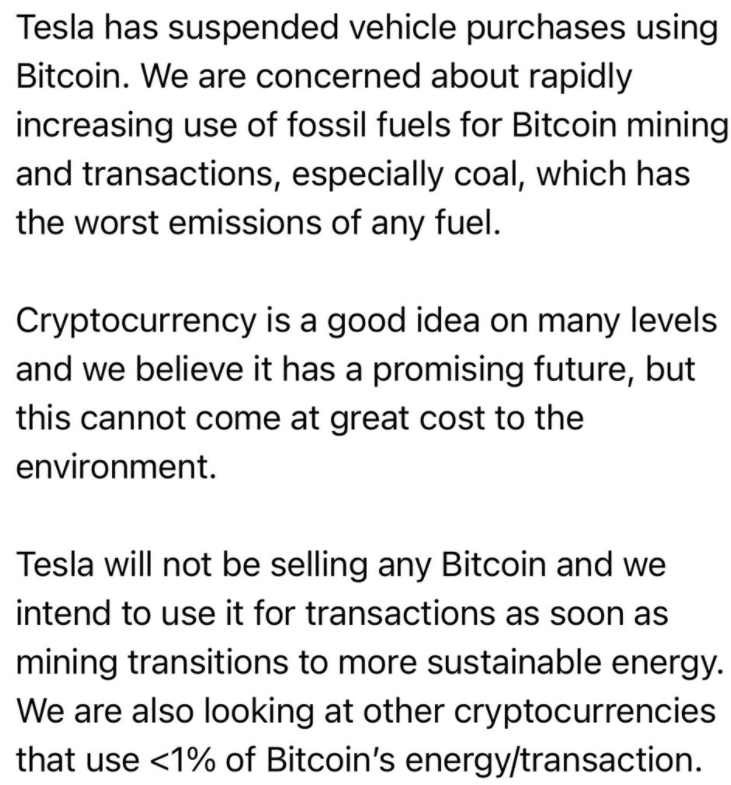 This tweet is something that most people already knew. The tech of Bitcoin is becoming outdated, and is consuming more and more energy, and its time to clear the playing field for new tech. Musk tweeted the following recently: