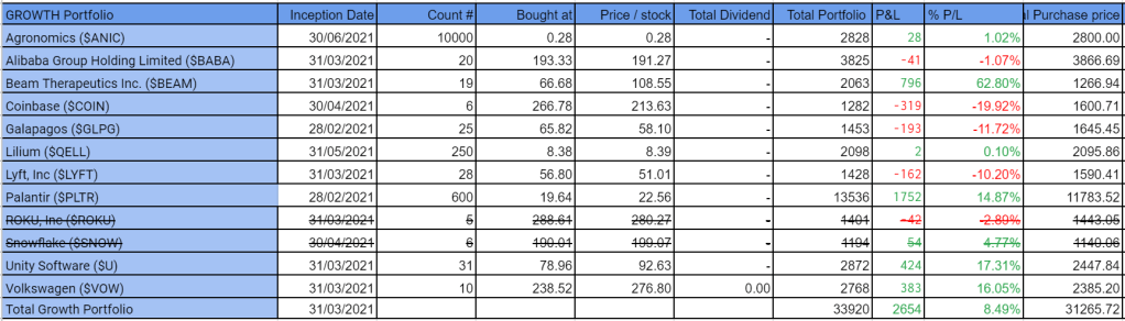 I sold Snowflake and Roku to buy into Agronomics. Not that I don’t like Roku or Snowflake but I just felt the technology behind Agronomics is to important not to support. You can watch a video why I invested in Agronomics here