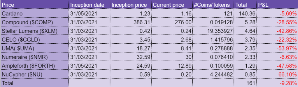 I bought 50 EUR of Cardano this month, and set up a recurring transfer of 50 EUR / month. I probably will only be investing in cardanno. The shitcoins I got for free on Coinbase have completely collided.