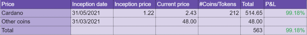 My Crypto strategy is to buy Cardano monthly. Additionally I take any free coin I can get on Coinbase as it comes buy. I buy every month but the amount is different, its anywhere from 30-100 EUR, but usually its around 50 EUR. I also have a dozen of other coins that I got for free, but I decided not to track them, but instead list them as other coins.