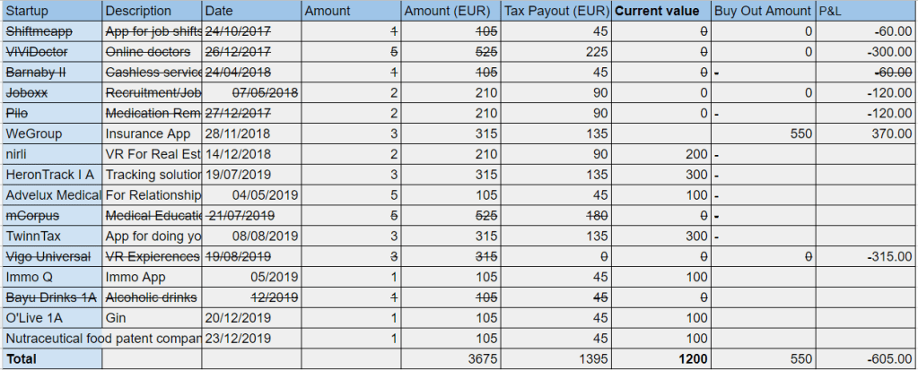 I cannot recommend investing in startups at spreads at this point. In 5 years I would have lost 2000 EUR. Because of the tax incentive it was limited to 600 EUR. Of course there is still startups alive, so there is some hope I could still make some money, but generally over a period of 5 years its a horrible performance, and the rate of bankruptcy is higher then I would have expected.