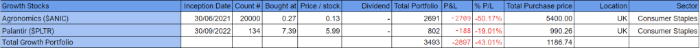 I also own 2 growth stocks. Notice how I am down more on this whole portfolio then on my complete dividend portfolio this year! I do see Agronomics a bit as a donation into something our planet really needs but as for other growth stocks I will be very careful to invest in these going forward.