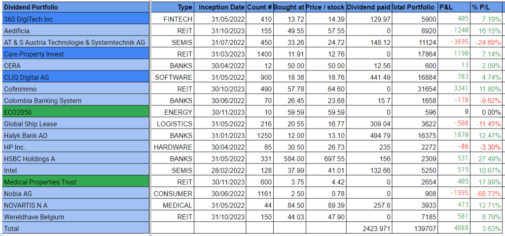 In green are the new additions to my Portfolio. Blue are positions I increased.