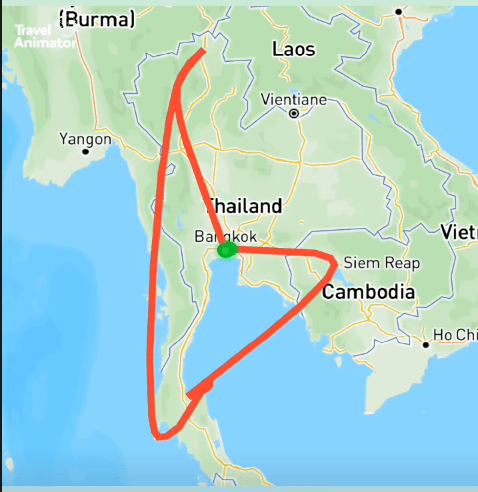 Ook ik volgde die route, zo bezocht ik: Brussel (vlucht) – Bangkok (nachttrein) – Chaing Mai (tour) – Chiang Rai – Chiang Mai (vlucht) – Phuket (overnachting) (minibus+boott) – Phi Phi Islands (boot + minibus) – Krabi (lokale bussen + ferry)- Ko Pangang (Ferry) – Ko Samui (Minibus – Ferry – Minibus) – Surat Tani (overnachting) (Vlucht) – Siem Reap (Nachtbus) – Bangkok (Vlucht) – Brussel